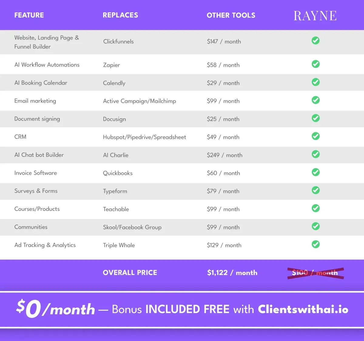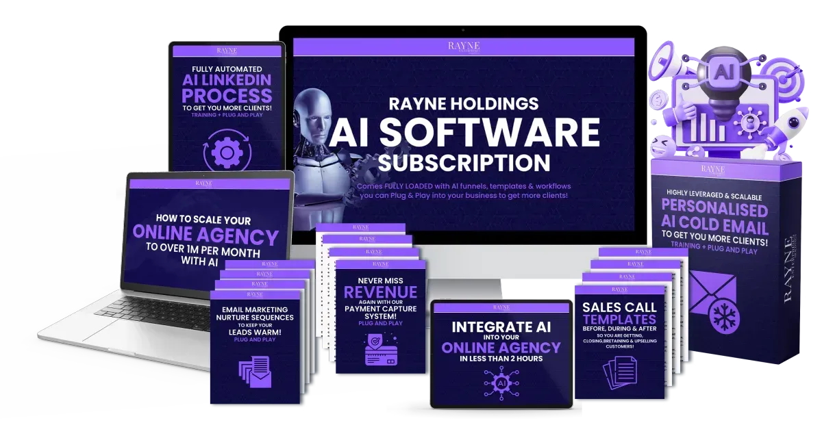 "Rayne AI Software Suite" (RRP$100) Dive into this juggernaut of growth with our Rayne AI Software Suite. This is where we manage millions in organizational assets and streamline complex processes with A.I. Say goodbye to juggling multiple subscriptions like Calendly, HubSpot, ClickFunnels, and others costing over $1,000 per month